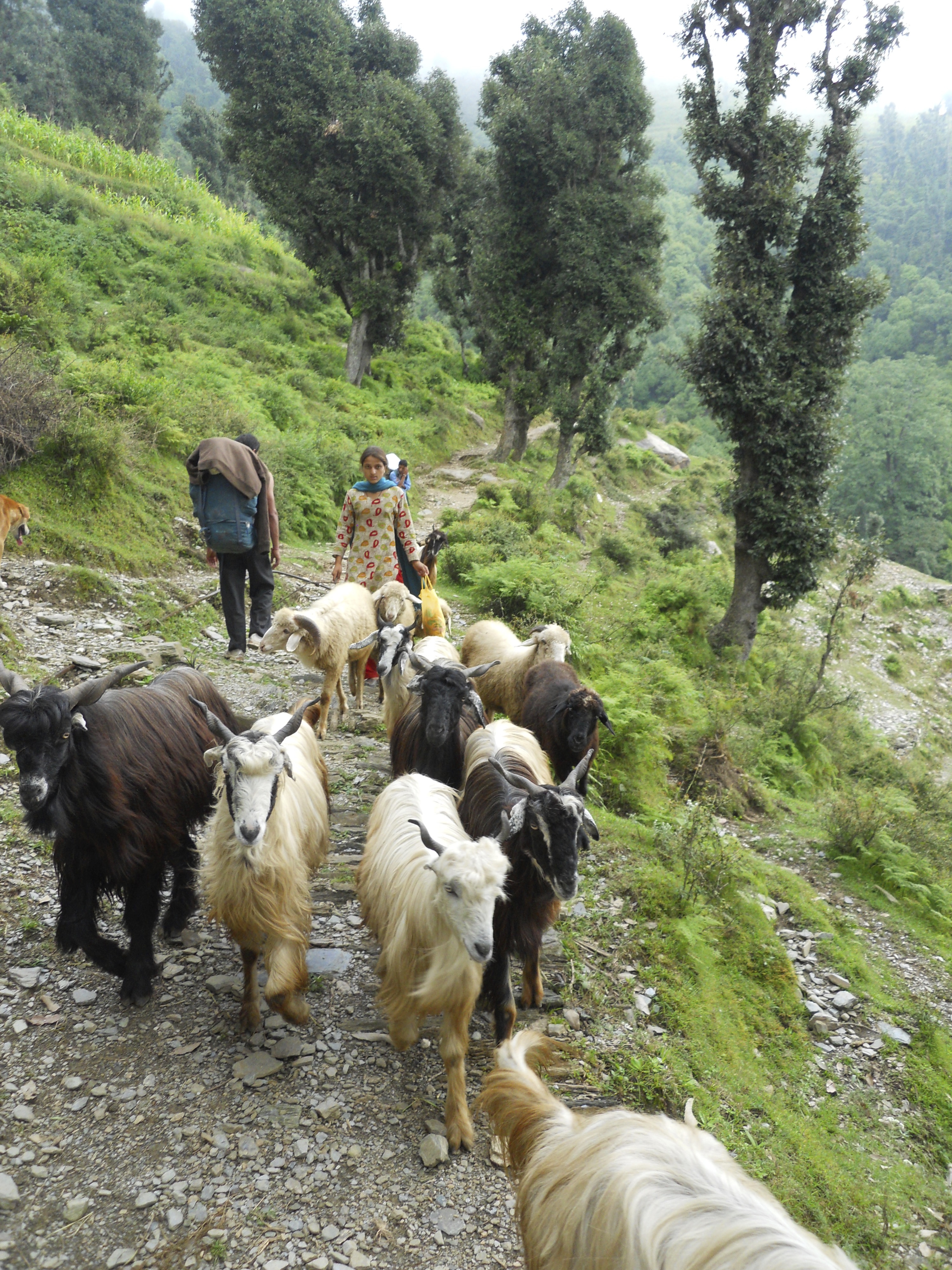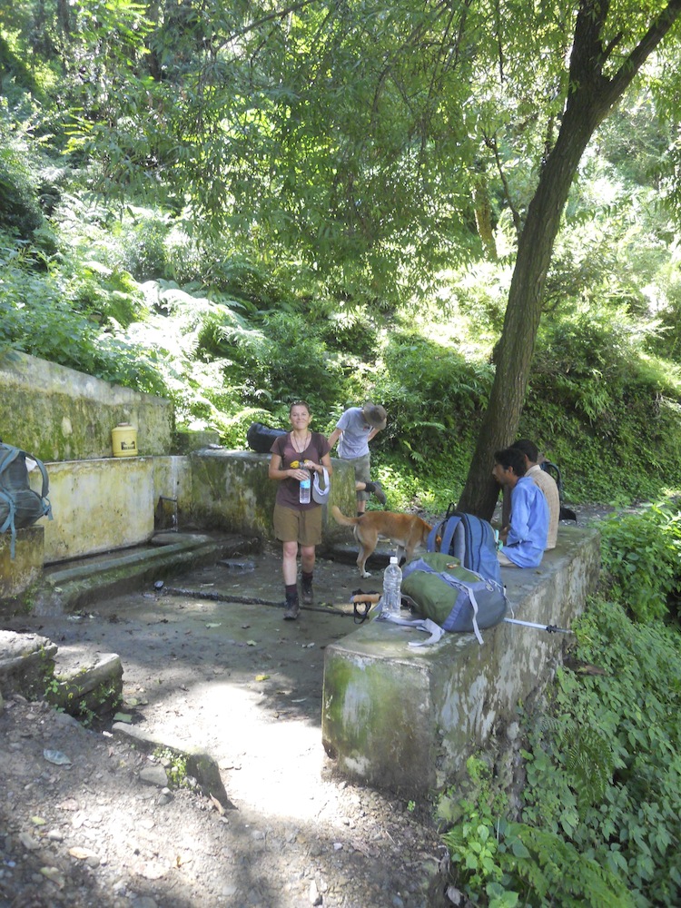 We immediately headed upwards. We were to go from 1350 metres to 2200 metres in 9 kilometres that day. That’s 900 metres in 9 kilometres. That’s a ten to one ratio. I don’t know if that’s relevant to anything but it’s an interesting number. After a couple minutes of climbing, we came to an easy path that ran around the contours of the mountain. It was only maybe ten minutes before we were climbing for a short while coming out onto a road! This was surprise. Happily, we were on the road for only a few hundred metres. What happened in those few hundred metres is that Kundan made his first major mistake of the day. In the pictures, you will see that he is carrying a large blue daypack that was lent to him by the Dhamis as his ultralight daypack was too small to be carrying his flute and the few essentials that we carried for use while walking. One of these essentials was a water bottle that was sitting on the side of the pack. While on the stretch of road, we were in direct mid-day sun and Kundan does not do well in such conditions. He rapidly started to flush from the heat. When he reached for the bottle, he discovered that it would require stopping to take off one side of the pack to reach said bottle. Rather than stop for such an operation he kept going. Big mistake! Even though it was a short time in minutes before our next rest stop, Kundan was severely weakened. He rehydrated but this short interlude was to haunt him later. [Lesson 1- ease of access to water supply. I’ll be carrying a hydration bladder in future walks]