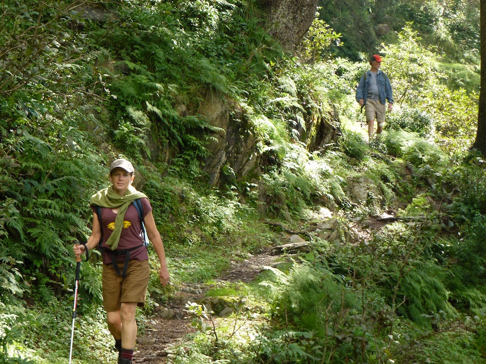 I had been enjoying a bit of excellent R&R at Orchard Hut for a week before my compatriots, Kerry and David arrived for our venture. Prakash had been saying that this was going to a ‘recon’ trek in preparation for other future treks. I was not inclined to take this attitude. I can now say that I have changed my mind. Using maps and photos, Prakash had proposed two alternative routes for our trek. At first, I leaned towards the one that would finish at a small high altitude lake. When it sank in that this route included six hours of completely uphill climbing on a steep ridge in one day, the light went on and we settled on the other route. David and Kerry went through it all with Prakash when they arrived and agreed to the proposed route. Two days at Rupili (a trekking hut that the Dhami’s had built on a 2200 metre high ridge. During the second day we would take a trek up to a higher ridge with great views. Third day, a shorter walk through forests to Khubi at 2800 metres. Overnight there and, then, to Sundarani at 2500 metres. The fifth day would be a walk along another high ridge and back to Sundarani. Sixth day a short trek down to meet the jeeps that would bring us back to the place where we walk up the hill to Orchard Hut. As Kerry’s last name is Sunderland, she liked the sound of Sunderani. When Prakash explained that ‘Sundar’ means beautiful and ‘Rani’ means queen, she liked it even more. So, that was the plan.
